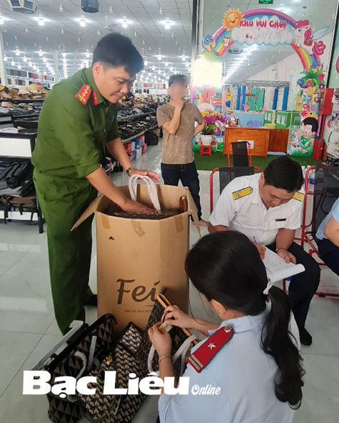 Đoàn kiểm tra liên ngành chống buôn lậu và hàng giả niêm phong túi xách giả mạo nhãn hiệu. Ảnh: T.Q