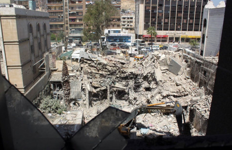 Máy xúc dọn dẹp đống đổ nát tại Lãnh sự quán Iran ở thủ đô Damascus (Syria) sau cuộc không kích. Ảnh: Internet
