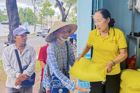 Bà Trương Hồng Vững đích thân trao từng bao gạo cho người lao động khó khăn.
