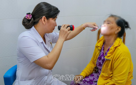 Bác sĩ Bệnh viện Đa khoa Cái Nước kiểm tra lâm sàng những dấu hiệu bất thường ở vòm hầu mũi cho một trường hợp bệnh nhân.