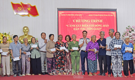 Trung tá Trương Văn Nhung, Bí thư Đảng uỷ, Chính trị viên Đoàn đặc nhiệm phòng, chống tội phạm ma tuý số 4 và đồng chí Võ Văn Đa, Phó Bí thư Thường trực Đảng uỷ phường An Xuyên, trao quà cho gia đình đồng bào Khmer.