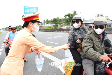 Để chia sẻ với người dân xa xứ về quê, các cán bộ, chiến sĩ Phòng Cảnh sát giao thông (Công an tỉnh) đã túc trực, đón ở các cửa ngõ vào tỉnh để “tiếp sức chặng đường dài”. Tại hai điểm trên tuyến Quốc lộ 1A và trên tuyến Quản Lộ - Phụng Hiệp, Cảnh sát giao thông Bạc Liêu đón bà con bằng nụ cười niềm nở, mời bà con dùng nước suối, khăn lạnh cho đỡ mệt. Hầu hết người tham gia giao không đã dừng xe lại nhận món quà nhỏ nhưng thật sự mát lòng này.