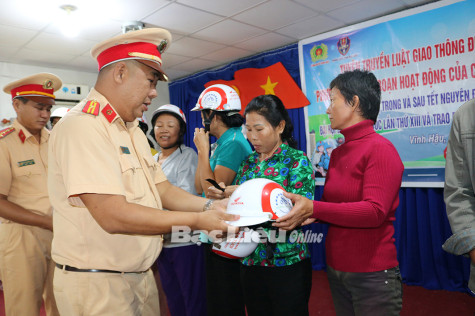 Tuyên truyền an toàn giao thông và tặng mũ bảo hiểm cho người dân.