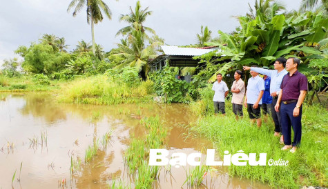 Ông Trần Anh Thi - Chủ tịch UBND huyện Vĩnh Lợi (bìa phải) cùng lãnh đạo các xã thuộc vùng trũng của huyện khảo sát các điểm ngập úng nặng do không có trạm bơm trong vụ lúa hè thu 2024. Ảnh: C.L
