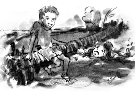 Nhà tôi có 5 anh chị em: 3 chị gái, anh Năm và tôi là út. Nói là út chứ tôi hung dữ nhất nhà. Có lần tôi bắt anh Năm phải cõng qua cầu dừa, nếu không tôi sẽ cắn. Biết tính tôi nói là làm, anh Năm dù không thích cũng phải để nhỏ em gái trên lưng đi qua cây cầu dừa. Tôi đang hí hửng, thích thú nghĩ tới cảm giác được tự tay bẻ trái ổi, cắn liền một cái chua chua, ngọt ngọt thì… ùm. Tôi rơi tự do từ trên lưng anh Năm xuống ao và cũng quẫy nước tự do vì tôi không biết bơi. Cảm giác phấn khởi cũng chìm nghỉm xuống ao chung với tôi, chỉ còn nghe tiếng anh Năm ngồi vắt vẻo trên cây cầu dừa, cười giòn, kêu mẹ: