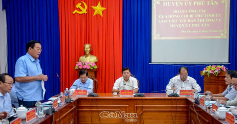 | (Từ trái sang) Đồng chí Lê Thanh Triều, Ủy viên BTV Tỉnh ủy, Trưởng ban Dân vận Tỉnh ủy (được BTV Tỉnh ủy phân công phụ trách chỉ đạo địa bàn huyện Phú Tân); đồng chí Nguyễn Tiến Hải, Uỷ viên BCH Trung ương Đảng, Bí thư Tỉnh uỷ, Chủ tịch HĐND tỉnh và đồng chí Nguyễn Phương Bắc, Tỉnh ủy viên, Bí thư Huyện uỷ Phú Tân, đồng chủ trì buổi làm việc. |