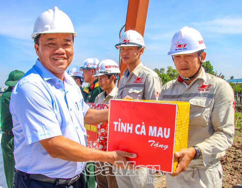 Đồng chí Huỳnh Quốc Việt, Phó Bí thư Thường trực Tỉnh uỷ Cà Mau, tặng quà chúc mừng năm mới đến toàn thể Ban Quản lý Dự án 166 và các nhà thầu thi công cao tốc đoạn Cà Mau - Cái Nước.