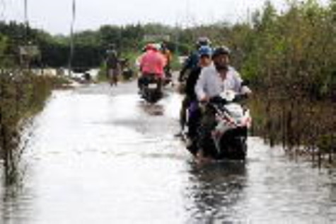 | Triều cường làm một đoạn đường tại ấp Nhưng Miên, xã Viên An Đông, huyện Ngọc Hiển bị ngập, người dân lưu thông khá chật vật. |