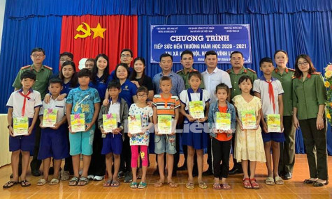 Chi đoàn Phòng An ninh kinh tế tặng quà tiếp sức đến trường cho học sinh nghèo xã Hưng Hội (huyện Vĩnh Lợi). Ảnh: H.T