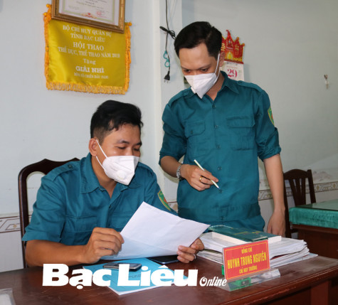Chỉ huy trưởng Ban CHQS phường 3 - Huỳnh Trung Nguyên (bên trái) xử lý công việc tại đơn vị. Ảnh: T.H