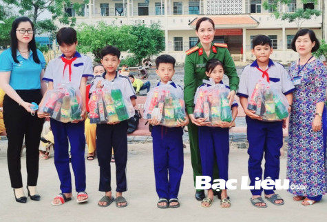 Chị Trần Kim Thới (bìa trái) vận động mạnh thường quân tặng quà cho học sinh nghèo. Ảnh: T.L