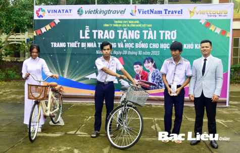 Đại diện Công ty TNHH Du lịch và Công nghệ Việt Nam tặng xe đạp, điện thoại di động cho học sinh nghèo Trường THPT Ninh Quới. Ảnh: Đ.K.C