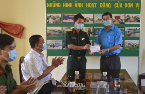 Chủ tịch Liên đoàn Lao động tỉnh Võ Thanh Tòng (bên phải) trao tặng số tiền 10 triệu đồng động viên tinh thần cán bộ, chiến sĩ làm nhiệm vụ tại khu cách ly tập trung Ban Chỉ huy Quân sự huyện Đầm Dơi.
