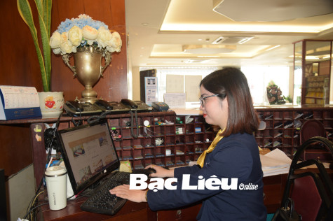 Nhân viên Nhà hàng - Khách sạn Sài Gòn Bạc Liêu giới thiệu các dịch vụ du lịch trên website dành cho khách quốc tế. Ảnh: H.T
