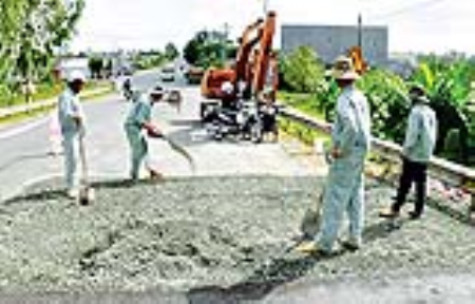 | Công nhân đang sửa chữa lại móng cầu xã Khánh An bắc qua sông lớn đường về Cà Mau. |