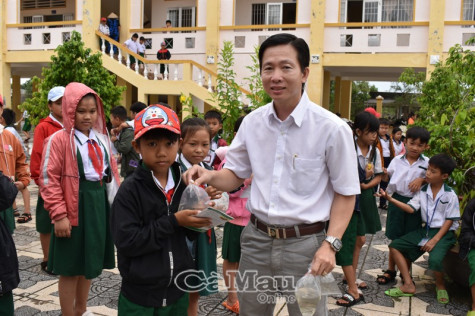 | Bác sĩ Tô Hoàng Vĩnh cấp phát cá bảy màu cho học sinh Trường Tiểu học Rạch Chèo, xã Rạch Chèo. |