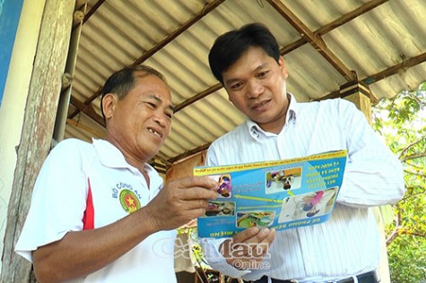 | Nhân viên Trạm Y tế xã Tạ An Khương Đông (phải) đến phát tờ rơi và tuyên truyền bệnh sốt xuất huyết cho người dân. |