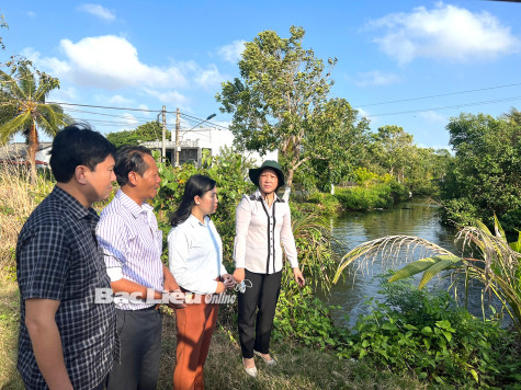Bà Lê Kim Thúy - Chủ tịch UBND TP. Bạc Liêu (bìa phải) cùng đoàn kiểm tra trạm bơm phục vụ tưới tiêu cho vùng sản xuất rau màu xã Vĩnh Trạch Đông và Vĩnh Trạch. Ảnh: H.T