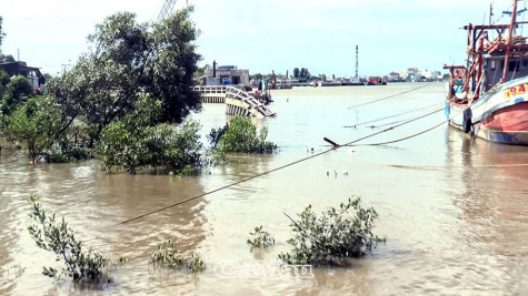 | Một đoạn bờ kè xã Tân Thuận, huyện Đầm Dơi bị sạt lở hồi giữa năm nay. |