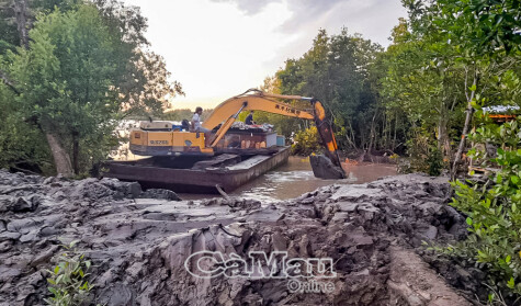 Người dân chủ động thuê cơ giới bồi đắp bờ bao vuông tôm để bảo vệ sản xuất.