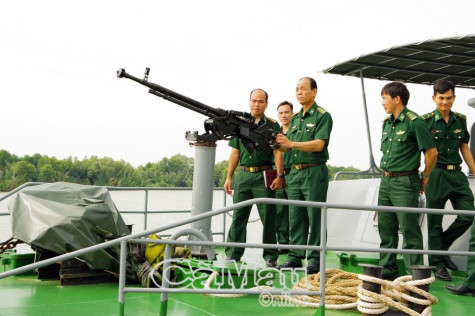 Đại tá Lương Hoàng Đông Kiểm tra trang bị vũ khí trên tàu tuần tra của Hải đội Biên phòng 2