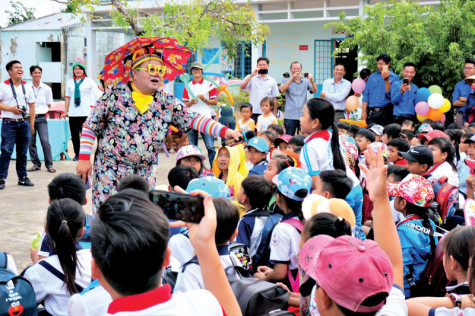 (CMO) Trên nền nhạc sôi động, chú hề xuất hiện với bộ đồ thùng thình, đầu đội cây dù sặc sỡ màu sắc, cùng cặp kính đồ chơi ngộ nghĩnh và cái mũi đỏ dễ thương làm cả sân trường rộn rã tiếng reo hò, vỗ tay, cười rôm rả của các em học sinh.