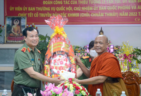 Thay mặt đoàn, Thiếu tướng Lê Tấn Tới gửi lời chúc mừng tốt đẹp nhất đến toàn thể các vị sư sãi, tăng tín đồ phật tử cùng đồng bào dân tộc Khmer ở Cà Mau đón Tết cổ truyền Chôl Chnăm Thmây vui tươi, đoàn kết và an lành.