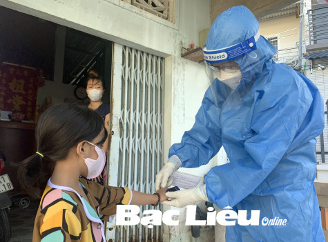 Bác sĩ Trạm Y tế Phường 5 (TP. Bạc Liêu) thăm khám bệnh nhân COVID-19 điều trị tại nhà. Ảnh: H.T