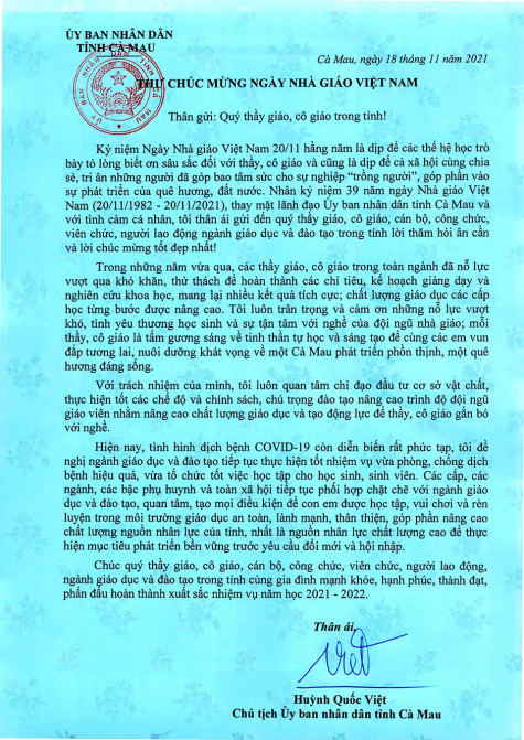 (CMO) Nhân kỷ niệm 39 năm ngày Nhà giáo Việt Nam (20/11/1982-20/11/2021), Chủ tịch UBND tỉnh Cà Mau Huỳnh Quốc Việt có thư chúc mừng gửi đến toàn thể quý thầy giáo, cô giáo, cán bộ, công chức, viên chức, người lao động ngành giáo dục và đào tạo. Báo Cà Mau trân trọng đăng tải toàn văn thư chúc mừng này.