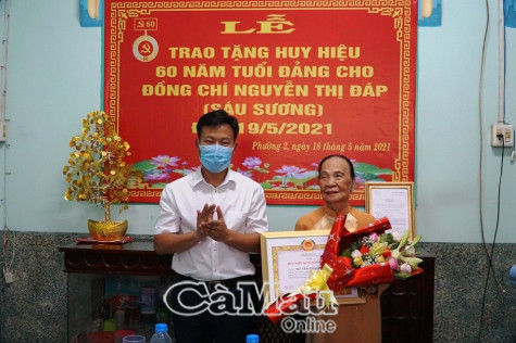 (CMO) Chiều ngày 18/5, Phó Bí thư Tỉnh uỷ, Chủ tịch UBND tỉnh Lê Quân đến trao Huy hiệu 60 năm tuổi Đảng cho đảng viên Nguyễn Thị Đáp (Nguyễn Ngọc Sương, sinh ngày 17/7/1942), khóm 2, phường 2 và đảng viên Huỳnh Uy Nghiêm (Hai Bạch, sinh ngày 21/8/1935), khóm 3, phường 2, Tp Cà Mau.
