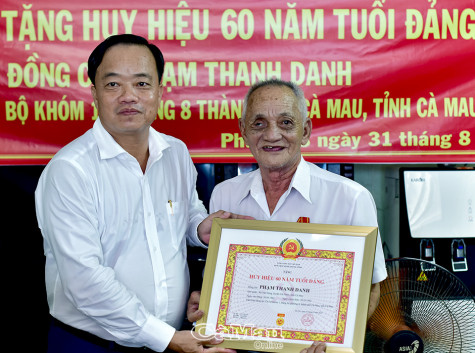 | Chủ tịch UBND tỉnh Cà Mau Huỳnh Quốc Việt trao Huy hiệu 60 năm tuổi Đảng cho đảng viên Phạm Thanh Danh. |