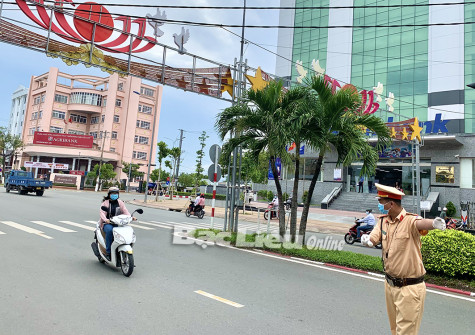 Lực lượng chức năng làm nhiệm vụ ở chốt kiểm soát dịch bệnh COVID-19 Phường 7 (TP. Bạc Liêu) kiểm tra người đi đường.