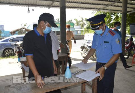 Lái xe khai báo y tế tại chốt kiểm soát dịch COVID-19 ấp Trà Ban (xã Châu Hưng A, huyện Vĩnh Lợi). Ảnh: C.K
