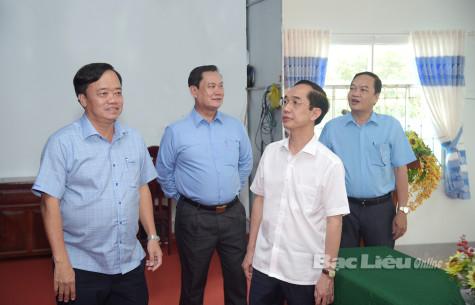 Phó Bí thư Thường trực Tỉnh ủy - Huỳnh Quốc Việt (bìa trái) kiểm tra công tác chuẩn bị tổ chức Đại hội Đảng tại xã Phong Thạnh Tây A (huyện Phước Long). Ảnh: H.T