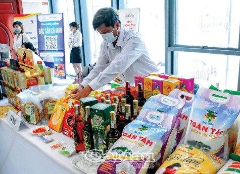 | Huyện Trần Văn Thời sẽ đồng hành để nâng sao cho các sản phẩm đã được công nhận sản phẩm OCOP. (Trong ảnh: Giới thiệu, xúc tiến thương mại thương hiệu gạo sạch Toàn Tâm của HTX Dịch vụ nông nghiệp Minh Tâm, ấp Cơi 5B, xã Khánh Bình Tây). |