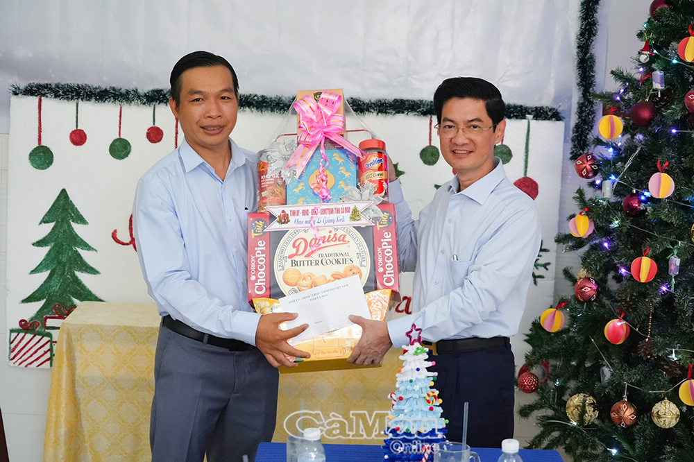 Giám đốc sở Văn hoá, Thể thao và Du lịch Nguyễn Quốc Thanh (bên phải) tặng quà chúc mừng Lễ Giáng sinh của tỉnh đến Chi hội Tin Lành Thới Bình.