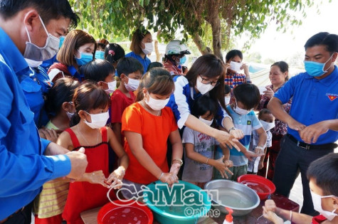Tuổi trẻ Cà Mau phát miễn phí khẩu trang, hướng dẫn trẻ em rửa tay bằng nước sát khuẩn. Ảnh Băng Thanh