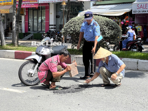 Người dân dặm vá một hố sụp nhỏ trên tuyến đường Trần Phú (TP. Bạc Liêu).