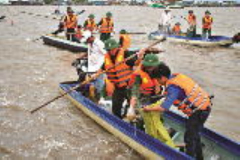 | Cán bộ, chiến sĩ BĐBP phối hợp thanh niên huyện Trần Văn Thời vớt rác tại cửa biển Sông Đốc. |