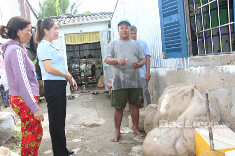 Bà Phan Thanh Thảo - Phó Chủ tịch UBND xã Vĩnh Trạch Đông (thứ hai từ trái sang) thăm hỏi hộ dân tộc Khmer - Thạch Khanh (ấp Biển Đông A, xã Vĩnh Trạch Đông, TP. Bạc Liêu). Ảnh: N.Q