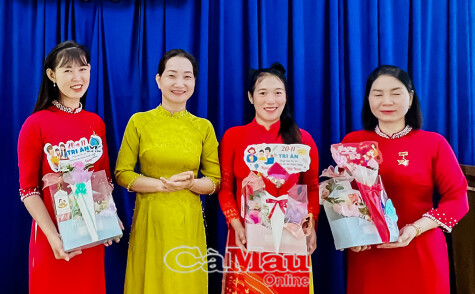 Ban Giám hiệu Trường Mầm non Phước Long tặng quà tri ân các cô Nguyễn Thị Cẩm Duyên, Nguyễn Yến Linh, Trương Mỹ Linh - những cá nhân xuất sắc của đơn vị.