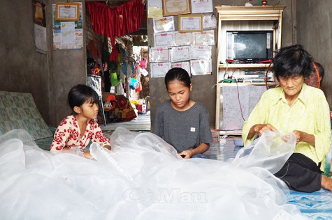 Tranh thủ những ngày hè, em Lâm Thị Tú Hà (giữa) phụ bà nội vá lưới mành để cha em đi đánh bắt thuỷ sản. |