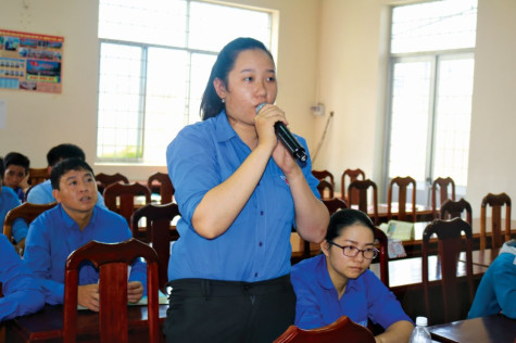 | Đoàn viên trình bày các thắc mắc liên quan đến vấn đề xuất khẩu lao động tại buổi tư vấn, thông tin về dịch vụ việc làm do Tỉnh đoàn tổ chức. |