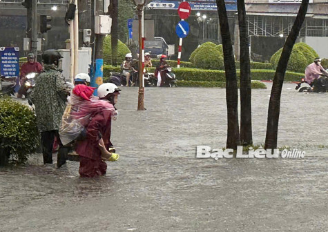 Sau vài giờ mưa lớn, các tuyến đường trung tâm của TP. Bạc Liêu như những dòng sông. Ngập sâu nhất là các tuyến Trần Phú, Hòa Bình, Võ Thị Sáu, Hoàng Diệu, Võ Văn Kiệt, Hùng Vương, có nơi nước dâng cao từ 0,8m - 1m. Nhiều tuyến đường, khu dân cư dù đã được nâng cấp phần nền nhưng không thoát cảnh ngập.