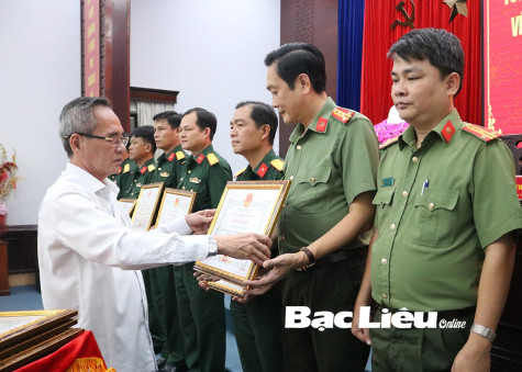 Bí thư Tỉnh ủy - Lữ Văn Hùng khen thưởng Công an tỉnh Bạc Liêu do có nhiều thành tích bảo vệ Tổ quốc trong tình hình mới. Ảnh: T.H