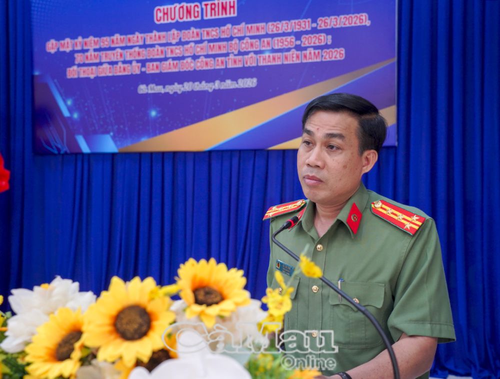 Báo Cà Mau Sáng 20/3, Công an tỉnh Cà Mau tổ chức gặp mặt kỷ niệm 95 năm Ngày thành lập Đoàn TNCS Hồ Chí Minh và 70 năm truyền thống Đoàn Thanh niên Bộ Công an, kết hợp đối thoại giữa Đảng uỷ, Ban Giám đốc Công an tỉnh với thanh niên năm 2026. Buổi gặp mặt do Đại tá Lê Tấn Vinh, Phó Bí thư Đảng uỷ, Phó Giám đốc Công an tỉnh chủ trì.