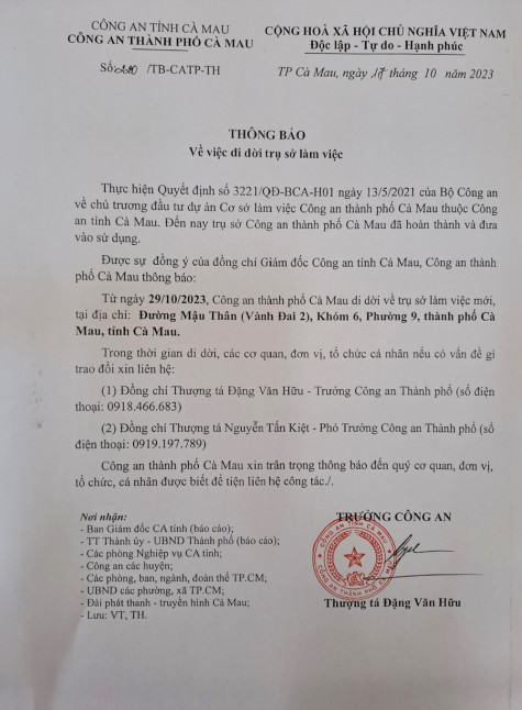 Trong thời gian di dời, các cơ quan, đơn vị, tổ chức, cá nhân nếu có vấn đề trao đổi, xin liên hệ đồng chí Thượng tá Đặng Văn Hữu - Trưởng Công an thành phố Cà Mau (số điện thoại: 0918.466.683); hoặc đồng chí Thượng tá Nguyễn Tấn Kiệt - Phó Trưởng Công an thành phố Cà Mau (số điện thoại: 0919.197.789).