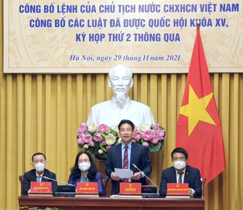 Sáng 29/11, tại Phủ Chủ tịch, Văn phòng Chủ tịch nước tổ chức họp báo công bố Lệnh của Chủ tịch nước về 2 luật đã được Quốc hội khóa XV thông qua tại kỳ họp thứ 2: Luật sửa đổi, bổ sung một số điều của Bộ luật Tố tụng hình sự; Luật sửa đổi, bổ sung một số điều và Phụ lục Danh mục chỉ tiêu thống kê quốc gia của Luật Thống kê.
