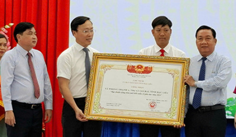 Lãnh đạo xã Phong Tân (TX. Giá Rai) nhận Quyết định công nhận xã đạt chuẩn NTM nâng cao.