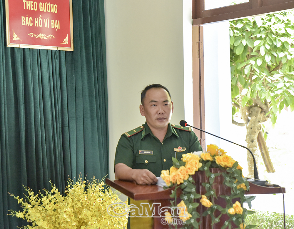 Thiếu tá Trần Văn Vĩnh, Chính trị viên phó Đồn Biên phòng Hòn Khoai thông tin về kết quả hoạt động của các đơn vị.